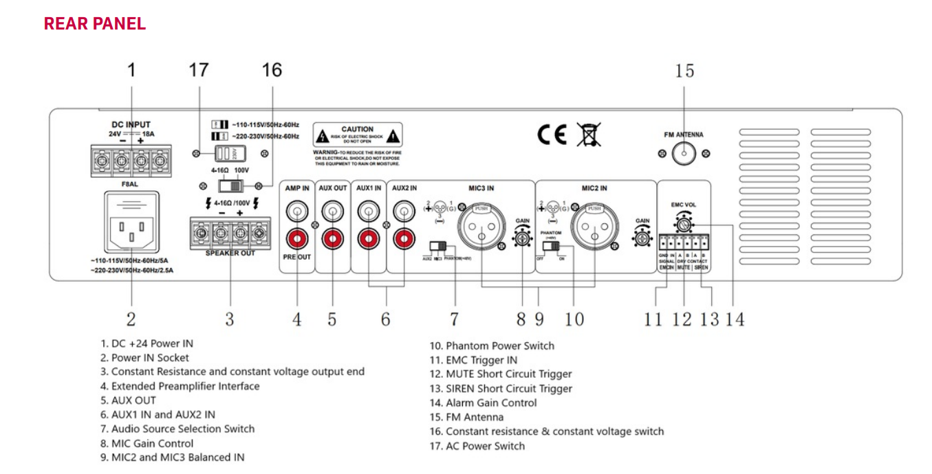 | Đầu ra âm thanh | Loa trở kháng cao 70V/100V và trở kháng thấp 4–16Ω |
