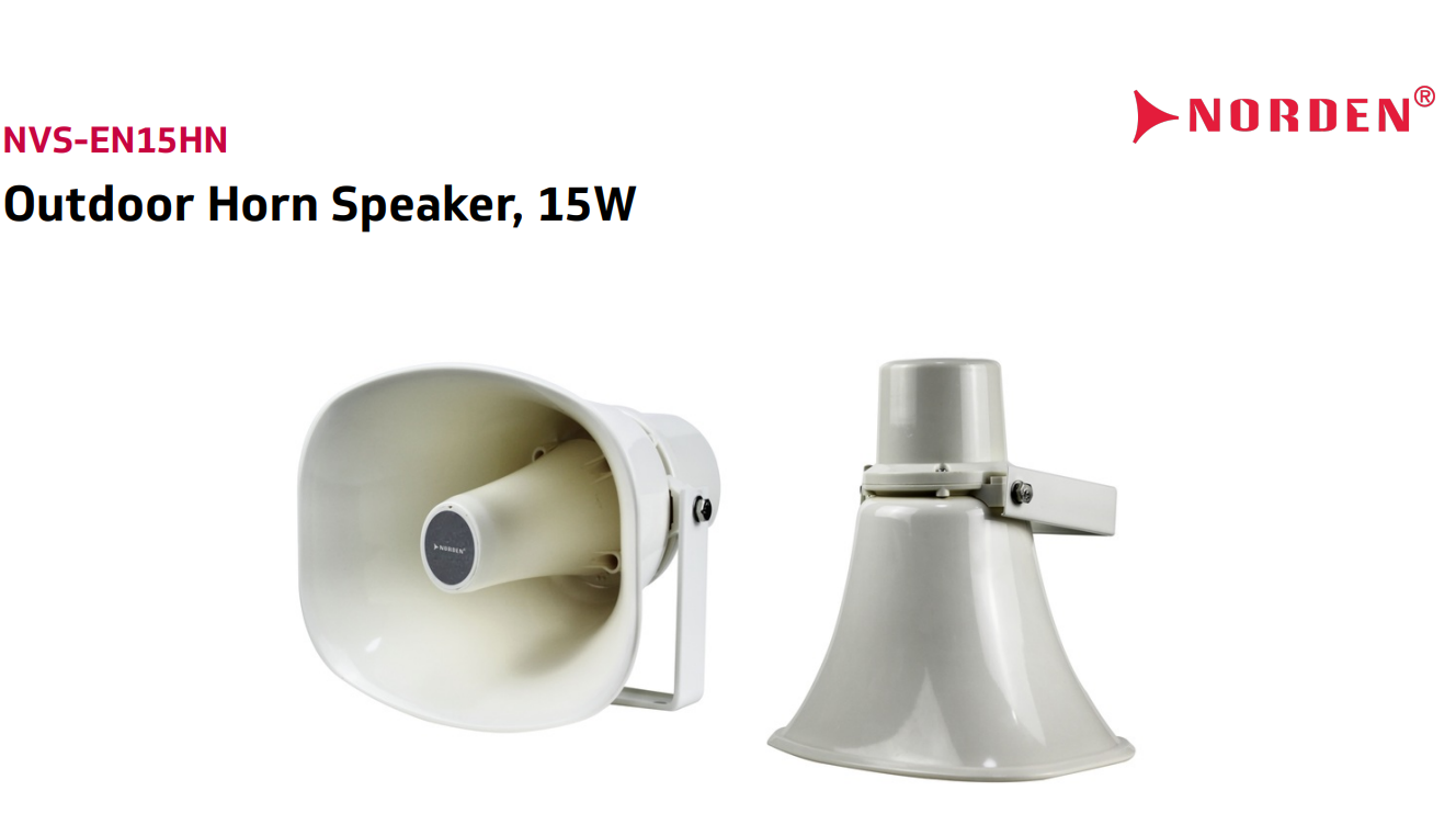 Loa phóng thanh ngoài trời NVS-EN15HN của Norden Communication được thiết kế cho các hệ thống phát thanh công cộng cần độ bền cao và âm thanh rõ ràng trong không gian mở. Với công suất 15W, loa phù hợp cho những khu vực có diện tích vừa và nhỏ, đảm bảo thông điệp được truyền đi rõ ràng và hiệu quả.