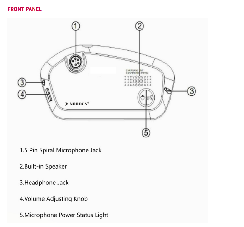 • Kết nối với bộ xử lý trung tâm, loa hội nghị, ampli và các phụ kiện Norden.