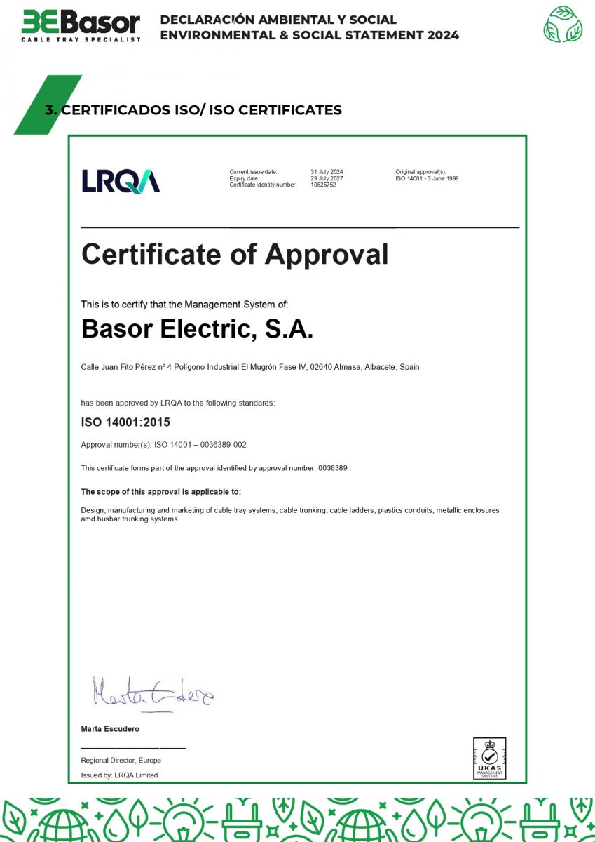 - Ngày 31/07/2024, Basor được cấp chứng chỉ ISO 14001:2015 với phạm vi thiết kế, sản xuất và kinh doanh hệ thống máng cáp, ống nhựa, vỏ kim loại và thanh dẫn busbar. Chứng chỉ có hiệu lực đến ngày 29/07/2027, khẳng định doanh nghiệp đã xây dựng hệ thống quản lý môi trường theo chuẩn quốc tế, kiểm soát tác động trong suốt vòng đời sản phẩm và cam kết giảm phát thải.