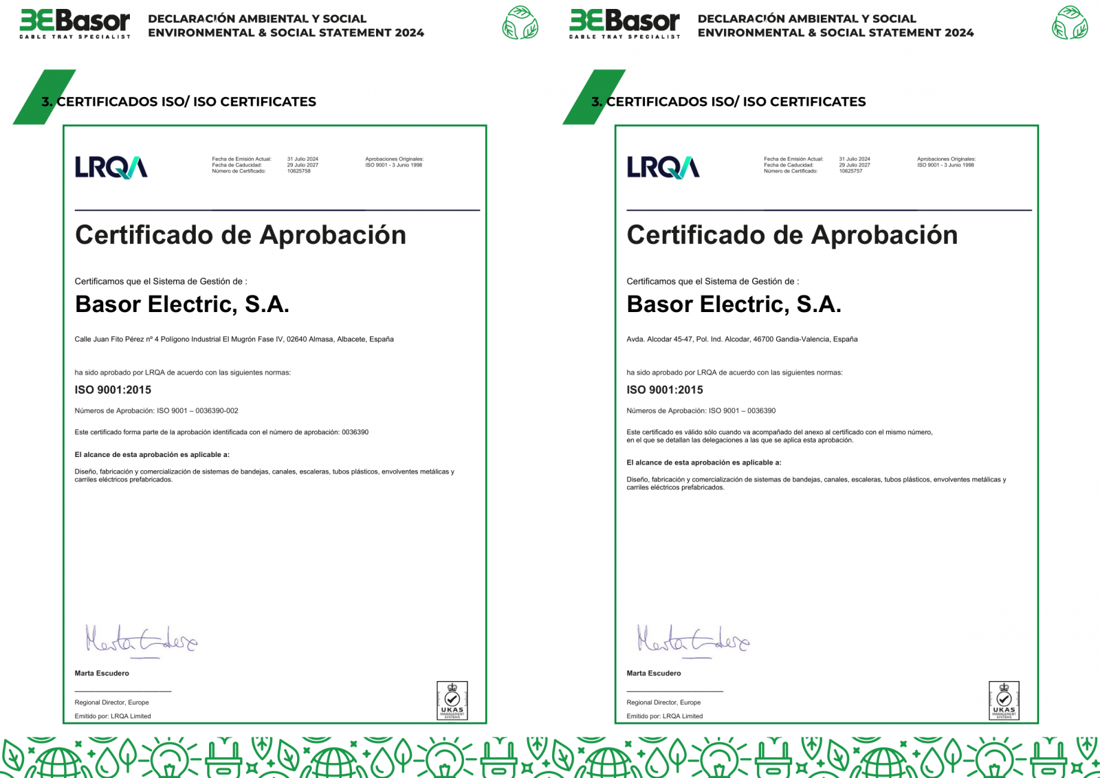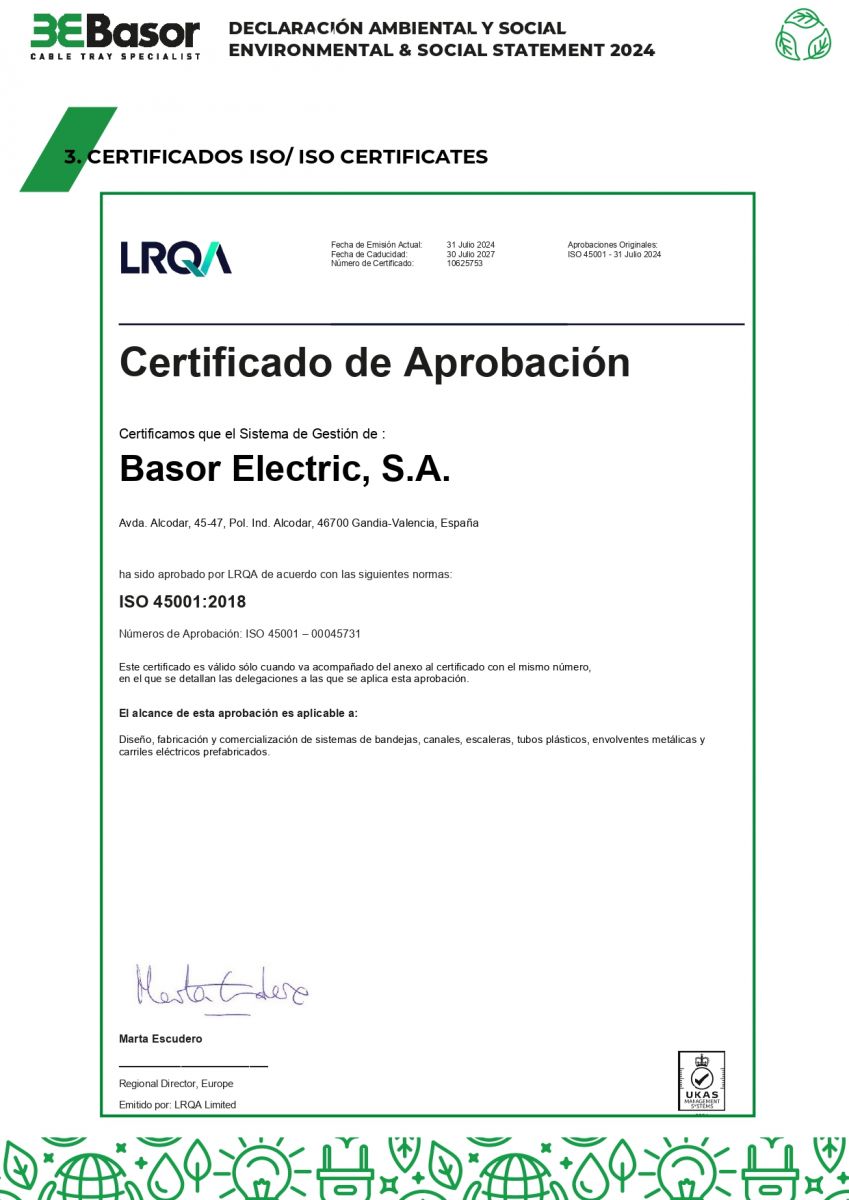 - Cũng trong ngày 31/07/2024, Basor được cấp chứng chỉ ISO 9001:2015, áp dụng cho trụ sở tại Gandia và cơ sở Almansa. Hiệu lực đến 29/07/2027, chứng chỉ này khẳng định công ty có hệ thống quản lý chất lượng ổn định, bảo đảm sản phẩm đáp ứng yêu cầu khách hàng và liên tục cải tiến quy trình.